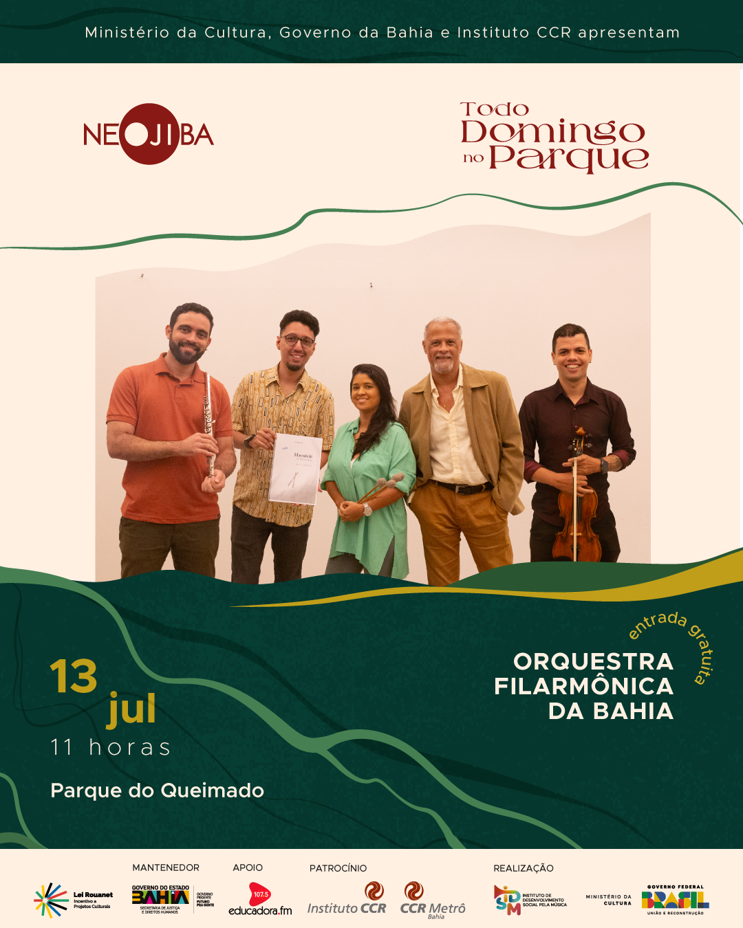 O Todo Domingo no Parque conta com patrocínio do Instituto CCR, na área de atuação da CCR Metrô Bahia (@ccrmetrobahiaoficial), via Lei de Incentivo à Cultura.
