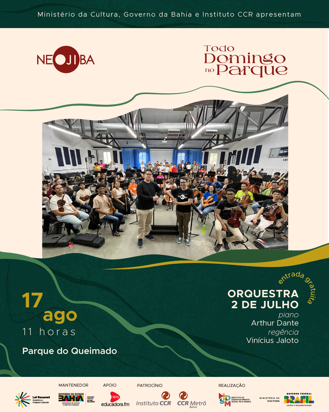 Neste Todo Domingo no Parque, dia 17/8, às 11h, a Orquestra 2 de Julho, regida por Vinicius Jaloto (@vinijaloto), apresenta um concerto especial no Parque do Queimado, na Liberdade. A entrada é gratuita!