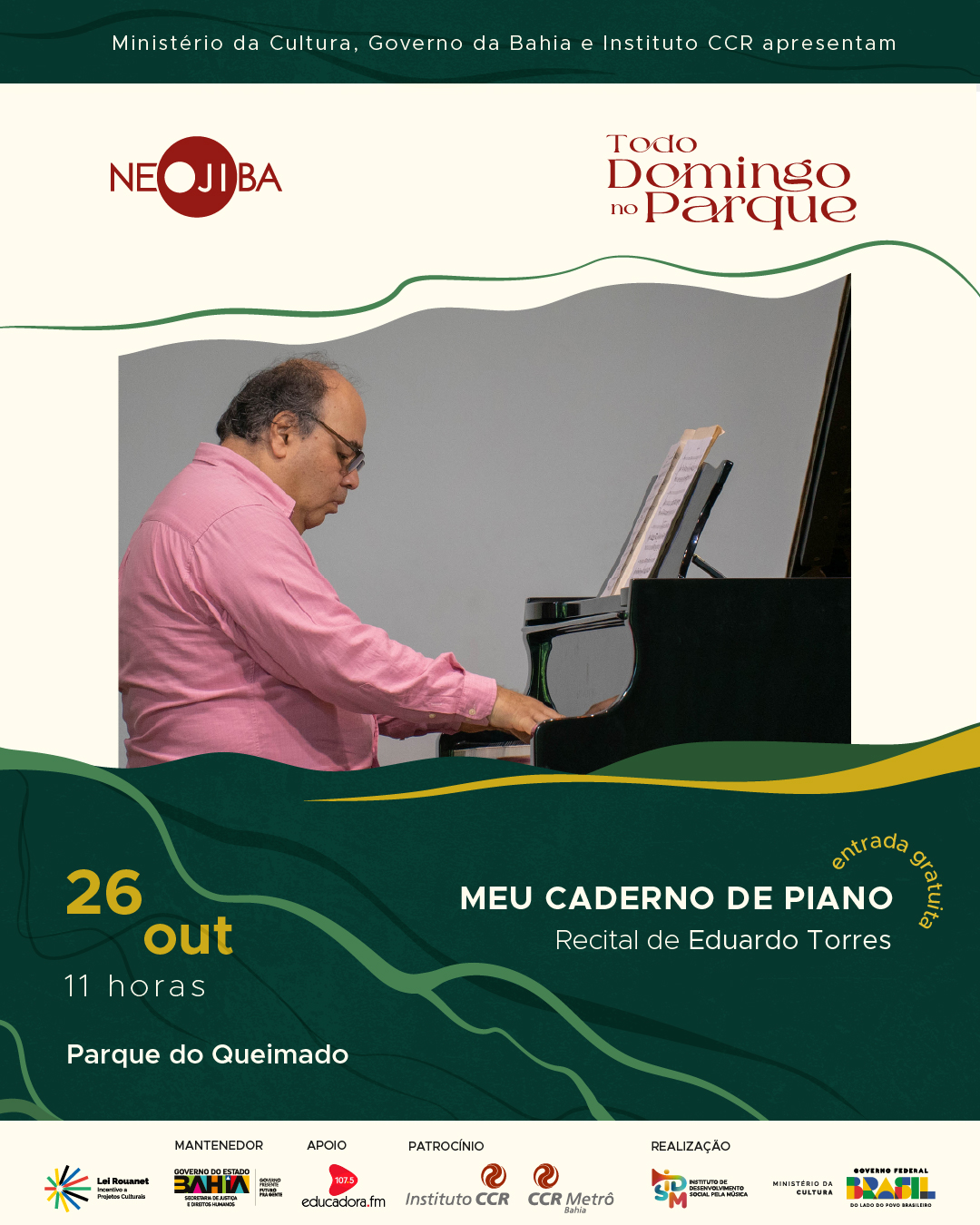 Às 11h, nosso diretor musical e pianista Eduardo Torres apresenta o recital "Meu Caderno de Piano" no Todo Domingo no Parque. 🎶✨