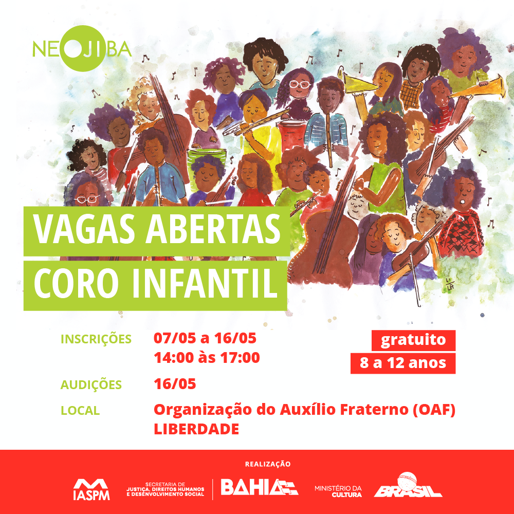Estão abertas as inscrições para o Coro Infantil do NEOJIBA. Podem se inscrever crianças com idades entre 08 e 12 anos. Os interessados devem comparecer à Organização do Auxílio Fraterno (OAF), na Liberdade, entre segunda (07) e quarta (16), das 14h às 17h (exceto sábado e domingo), para realizar a inscrição. É também nesse espaço que vão acontecer todas as etapas do processo seletivo e os ensaios do Coro Infantil.