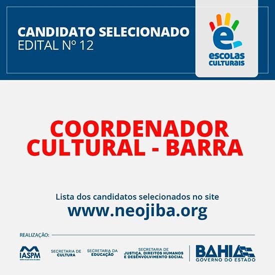 Resultado Final Edital 12 seleção coordenador cultural – vaga remanescente em Barra (Edital de seleção nº 6)