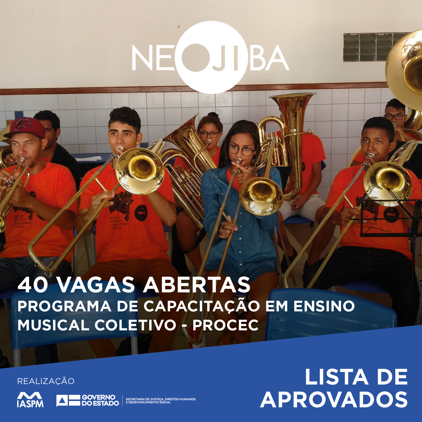 Ao todo, 40 jovens músicos multiplicadores de 17 cidades baianas, representando dez territórios de identidade, foram selecionados como bolsistas do Programa de Capacitação em Ensino Musical Coletivo. Durante 10 meses, eles serão capacitados pelo Programa NEOJIBA e orientados enquanto exercitam o ensino coletivo de música no projeto musical do qual fazem parte, em suas cidades. Confira a LISTA DOS APROVADOS