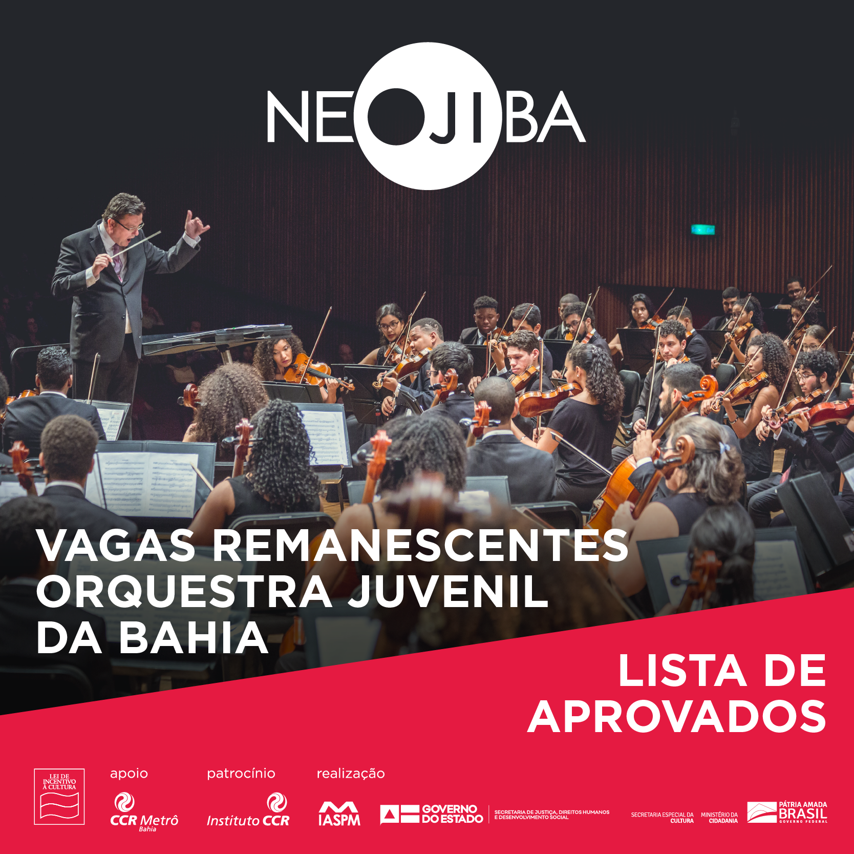 - BA, responsável pela gestão do programa NEOJIBA (Núcleos Estaduais de Orquestras Juvenis e Infantis da Bahia) por força do contrato de gestão no 0001/2014 celebrado com a Secretaria de Estado de Justiça, Direitos Humanos e Desenvolvimento Social da Bahia, TORNA PÚBLICAS as normas relativas ao Processo Seletivo para preenchimento de vagas remanescentes na ORQUESTRA JUVENIL DA BAHIA, que poderá em certas ocasiões se apresentar com o nome de ORQUESTRA SINFÔNICA NEOJIBA ou ORQUESTRA NEOJIBA, durante o ano de 2019.