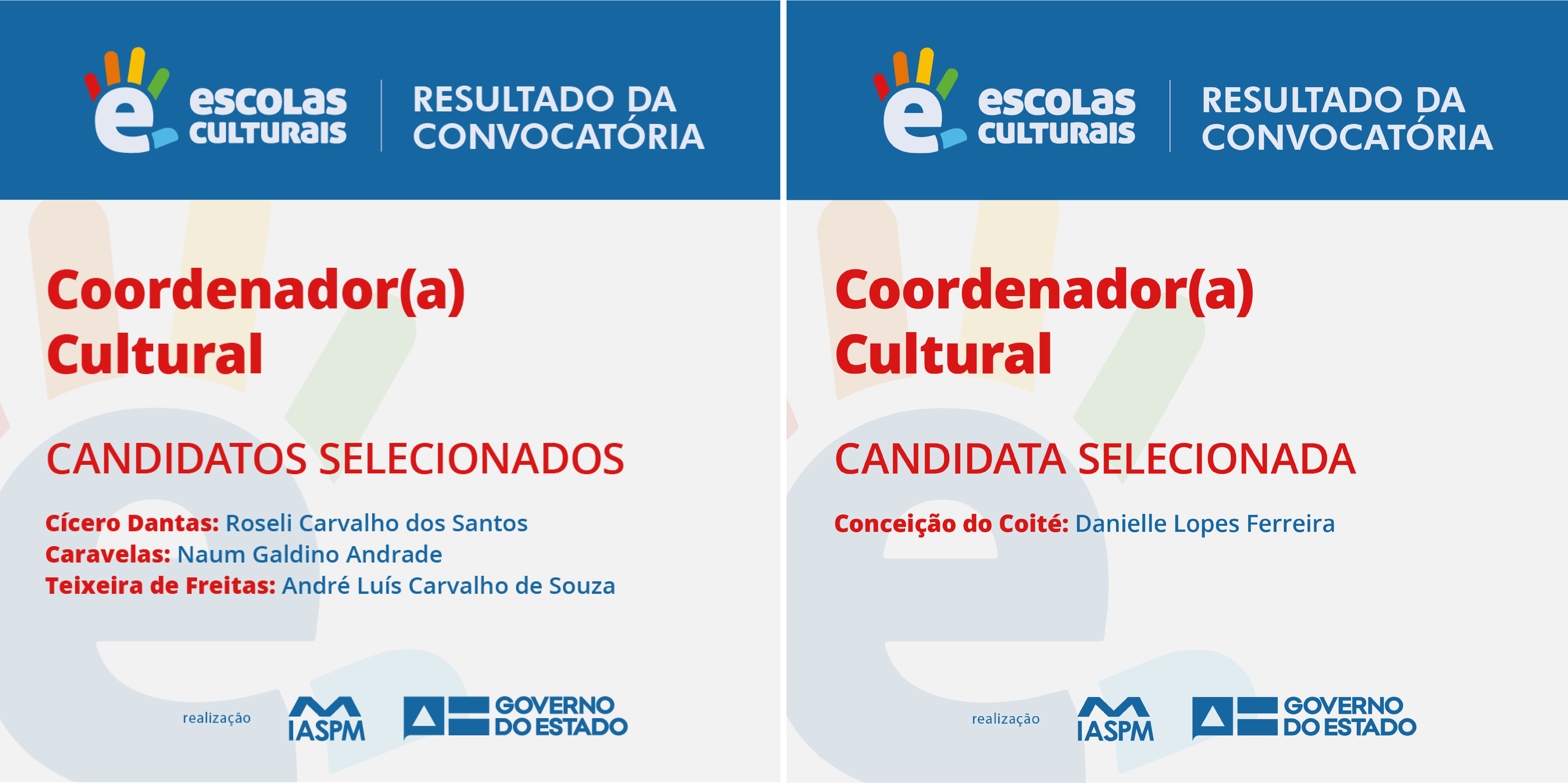 Divulgado o resultado da convocatória para seleção de coordenadores culturais do projeto Escolas Culturais para os municípios de Conceição do Coité, Cícero Dantas, Caravelas e Teixeira de Freitas. Parabéns aos selecionados!