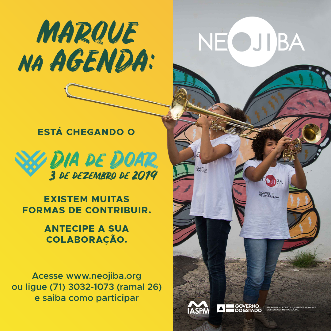 Agende esta terça-feira (3), pois é o ‘Dia de Doar’! E o NEOJIBA (www.neojiba.org), mais uma vez, participa desse movimento que nasceu nos Estados Unidos em 2012, no Brasil em 2013 e hoje tem mobilização global. A ideia é provocar uma Cultura de Doação, uma coalização de organizações e indivíduos que promovam o engajamento das pessoas com as causas e as organizações da sociedade civil.