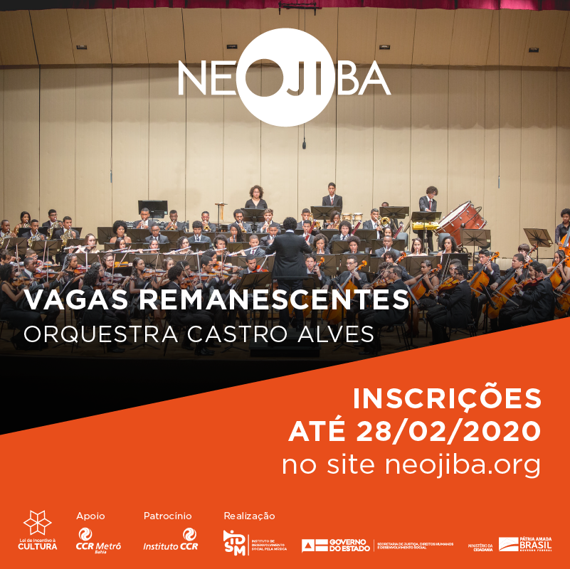Inscreva-se para o processo seletivo e participe de uma grande orquestra do NEOJIBA em Salvador. Você terá também a oportunidade de tocar na Orquestra Castro Alves e participar de incríveis concertos promovidos pelo programa. As inscrições estão abertas até dia 28 de fevereiro de 2020, uma sexta-feira, e podem ser feitas no site do NEOJIBA. Todos os detalhes sobre este processo seletivo, relacionados a regulamento, repertório e instruções para gravação do vídeo você encontra abaixo.