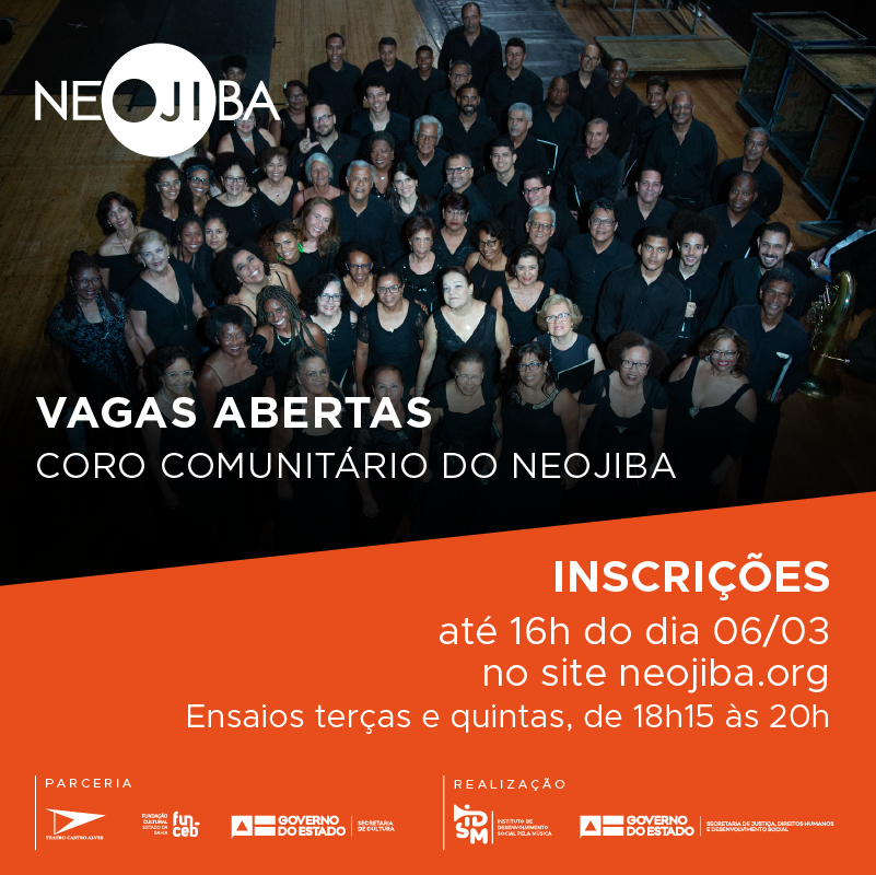 Você gosta de cantar e quer fazer parte do NEOJIBA? Estão abertas as inscrições para participar do Coro Comunitário do NEOJIBA (antigo Coro Sinfônico). O Coro é para adultos e sem limite de idade.