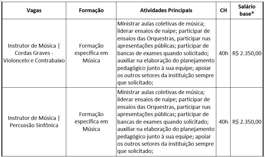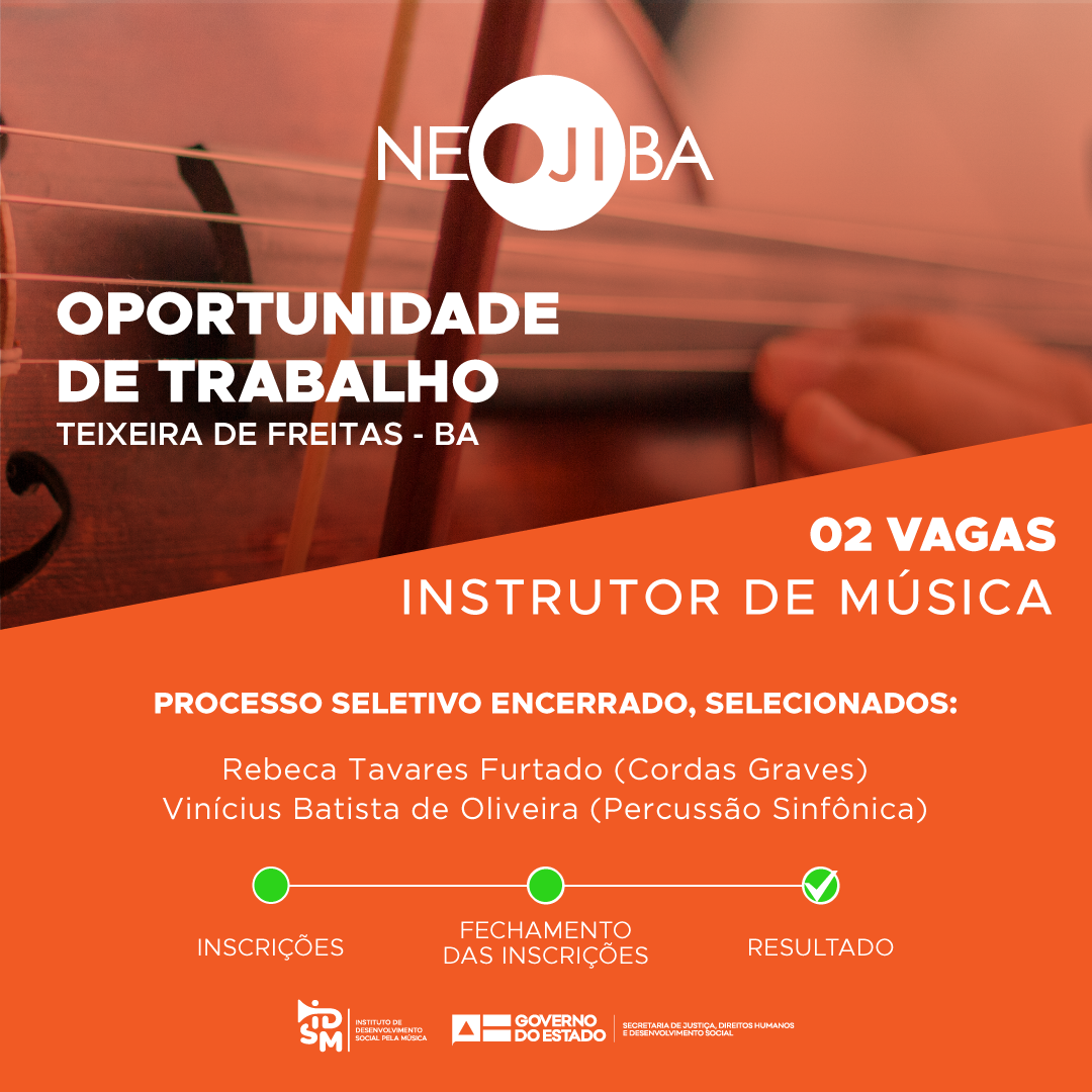 O Instituto de Desenvolvimento Social pela Música (IDSM), Organização Social que faz a gestão do PROGRAMA NEOJIBA (Núcleos Estaduais Juvenis e Infantis da Bahia), no uso de suas atribuições legais, torna pública a realização do Processo Seletivo Simplificado para contratação de pessoal, em regime CLT, para o cargo de Instrutor de Música para Percussão Sinfônica e Cordas Graves (violoncelo e contrabaixo) . Ao todo são 02 (Duas) vagas.