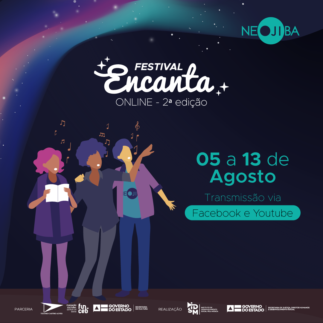 O NEOJIBA não para. Entre os dias 5 (amanhã) e 13 de agosto, o programa social do governo da Bahia promove a segunda edição do Festival NEOJIBA Encanta, com apresentações e conversas sobre canto coral. Por causa da pandemia do coronavírus, os eventos serão online, com transmissão pelo Facebook e YouTube. Entre os destaques da programação estão dois recitais online do Coro Juvenil, principal formação de canto coral do NEOJIBA, que vão acontecer no dia 5/8, às 19h, e no dia 7/8, às 18h. No repertório, peças de compositores como Mozart, Puccini e os brasileiros Heitor Villa-Lobos e Waldemar Henrique.