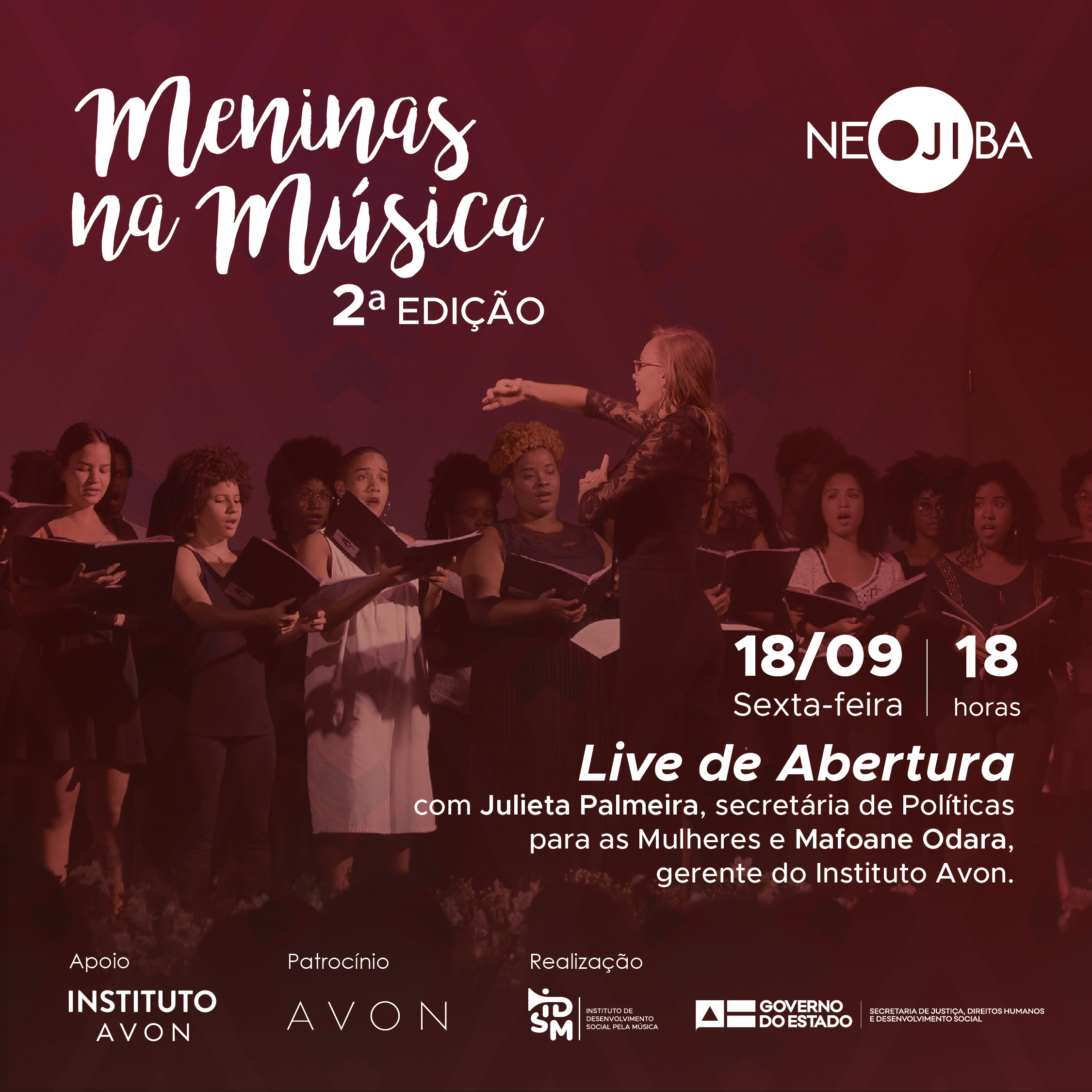 Na próxima sexta-feira, 18 de setembro, acontece a live de lançamento do segundo ano do projeto Meninas na Música, realizado pelo NEOJIBA (programa social do Governo da Bahia) com patrocínio da AVON e apoio do Instituto Avon. O projeto foi criado para promover a equidade de gênero e o empoderamento feminino no universo da música, além de despertar a conscientização do papel de todos, homens e mulheres, na construção de uma sociedade sem preconceitos e sem violência contra as mulheres.