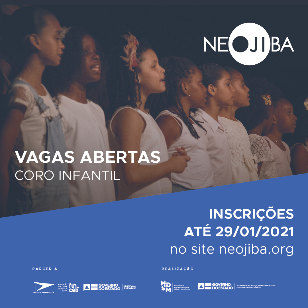 Inscreva-se nesta audição e venha fazer parte do Coro Infantil do NEOJIBA, em Salvador. Se for aprovado, você terá acesso ao ensino de excelência do NEOJIBA em prática musical coletiva e ainda fará muitas amizades, que levará para vida inteira. As inscrições estão abertas até o dia 29 de janeiro de 2021, uma sexta-feira, e podem ser feitas preenchendo o formulário online. Todos os detalhes relacionados a regulamento, repertório e instruções para a audição presencial você encontra no Regulamento (link abaixo)