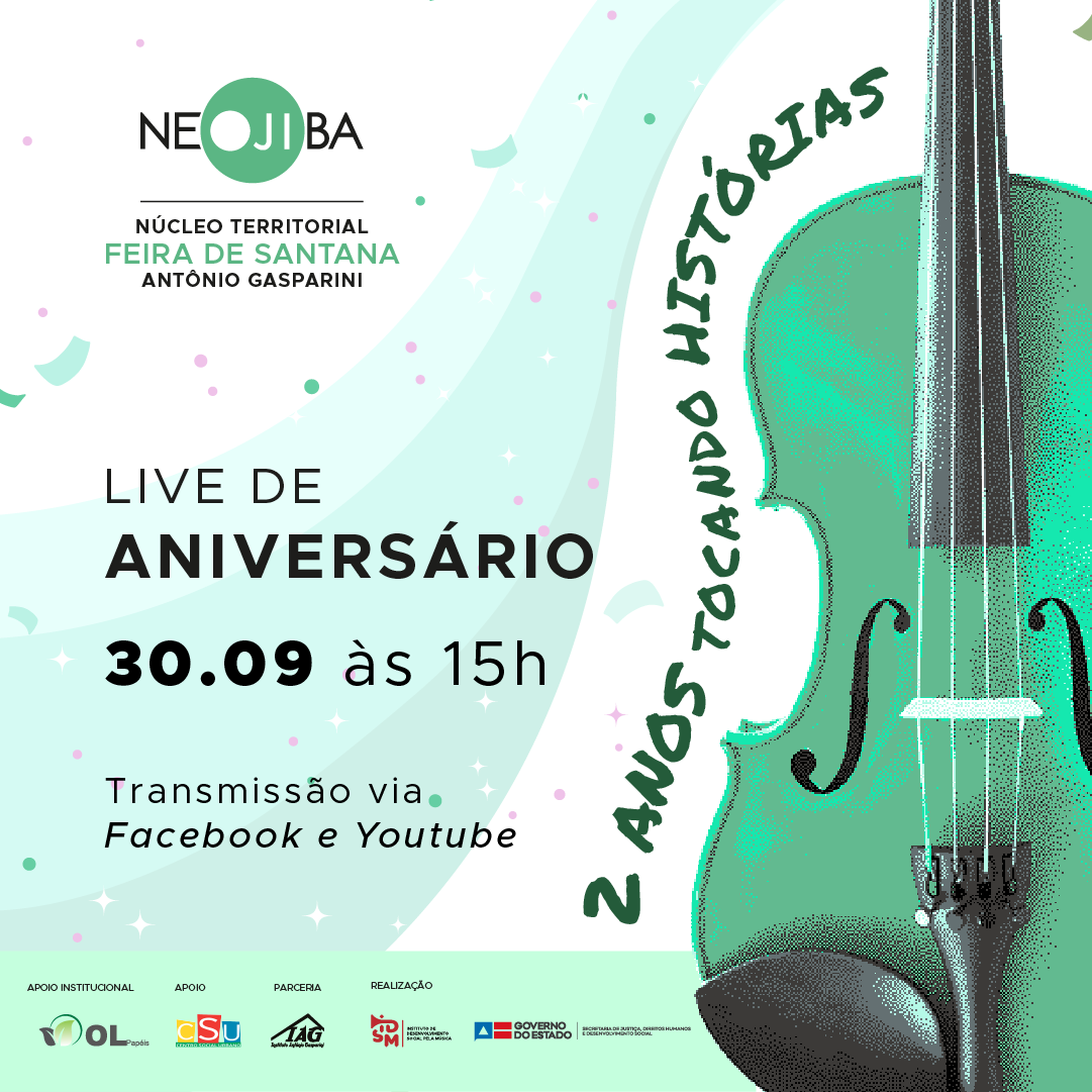 Na próxima quinta-feira, 30 de setembro, o Núcleo Territorial NEOJIBA Feira de Santana - Antônio Gasparini realiza a “Live de Aniversário: dois anos tocando histórias”, em comemoração ao seu segundo ano como Núcleo Territorial. Para celebrar a data, bem como os impactos sociais gerados pelo Núcleo desde que foi inaugurado, o NTN irá realizar um evento ao vivo e aberto ao público através das redes sociais.