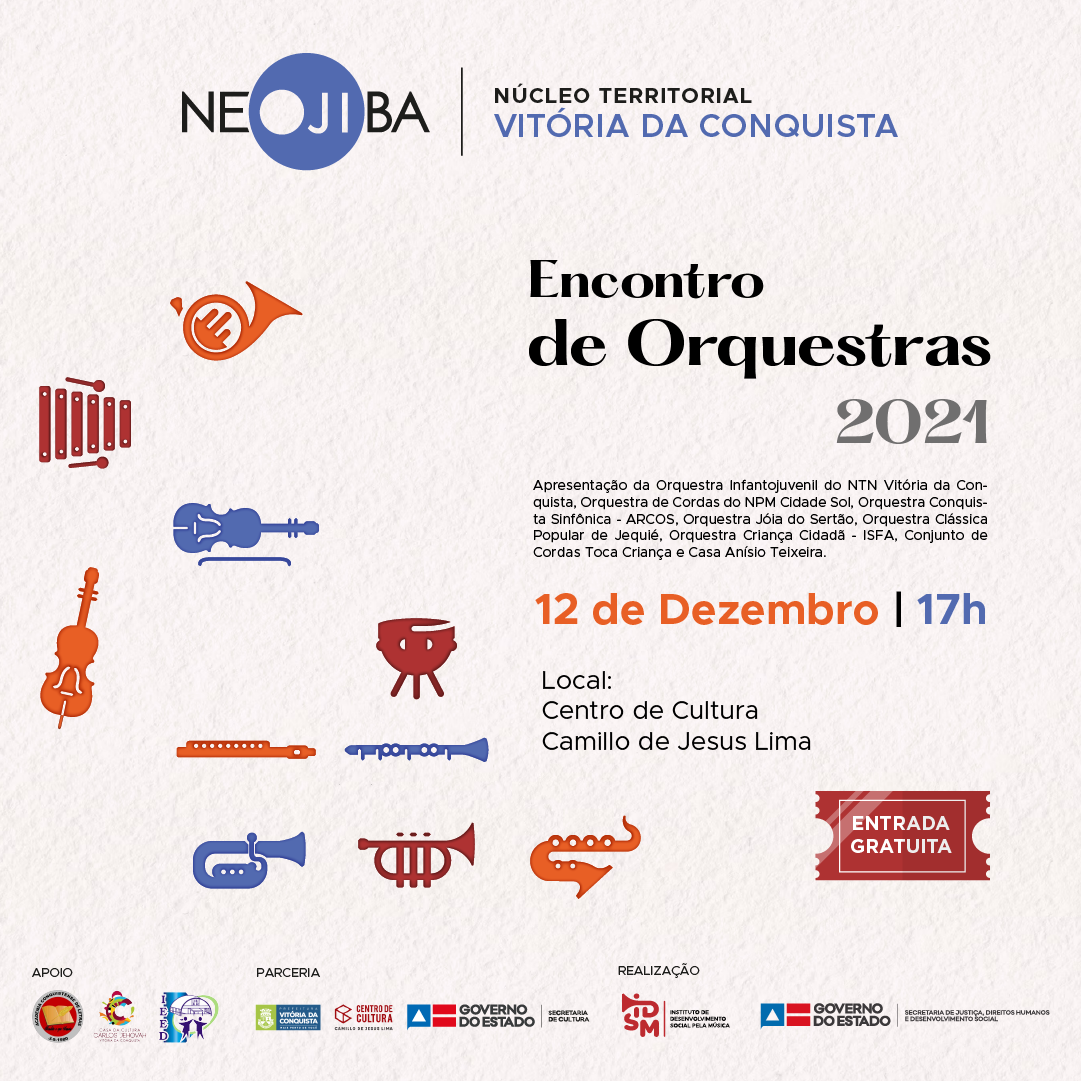 12/12, às 17h, na Sala de Espetáculos do Centro de Cultura - Encontro de Orquestras 2021, com integrantes da Orquestra Infantojuvenil do NTN Vitória da Conquista, Orquestra de Cordas do NPM Cidade Sol, Orquestra Conquista Sinfônica - ARCOS, Orquestra Jóia do Sertão, Orquestra Clássica Popular de Jequié, Orquestra Criança Cidadã, Conjunto de Cordas Toca Criança e Casa Anísio Teixeira. Ingressos gratuitos disponíveis na véspera da realização do evento.