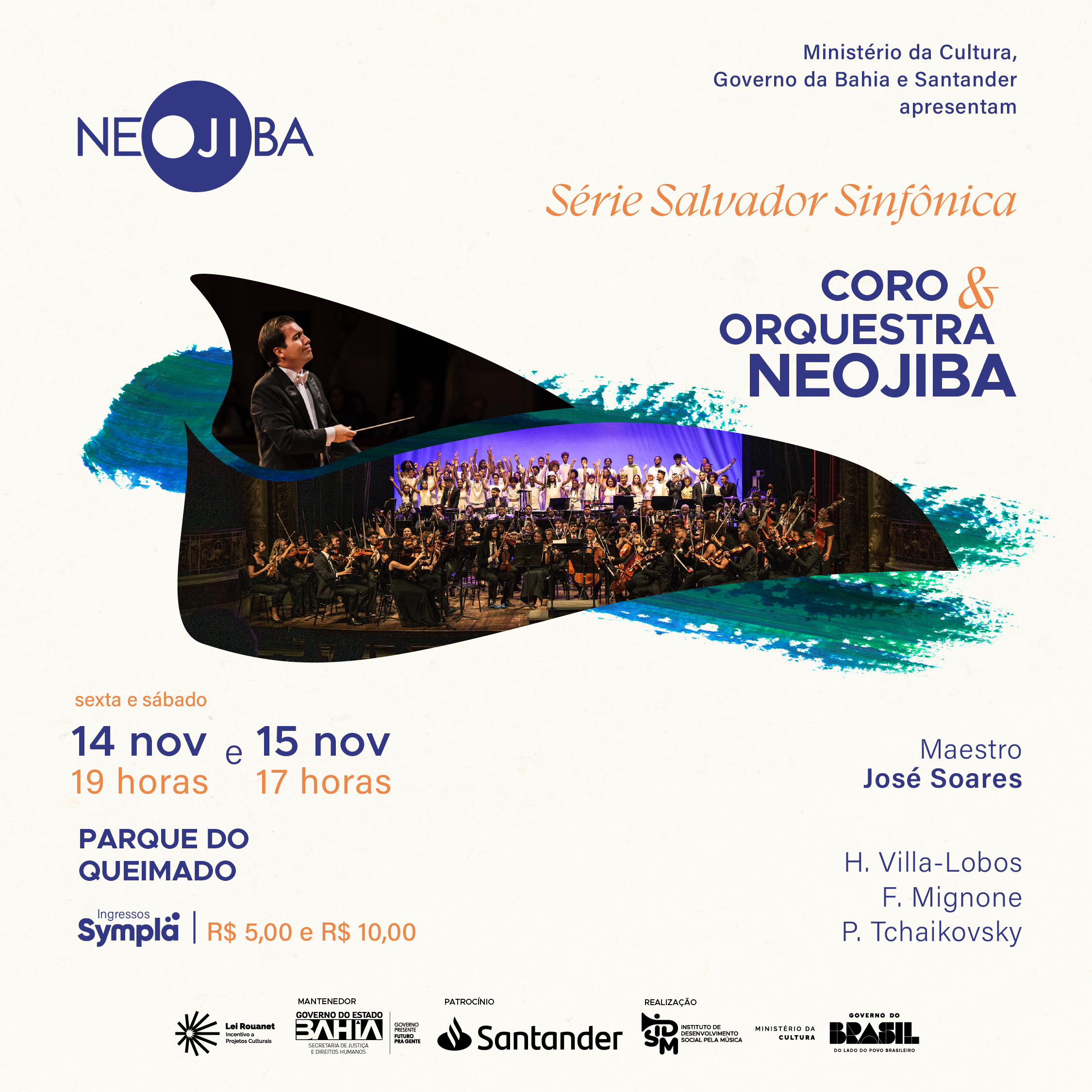 Nos dias 14 e 15 de novembro, o público baiano poderá assistir a dois concertos especiais no Galpão NEOJIBA, no Parque do Queimado, em Salvador. Sob a regência do maestro convidado José Soares, Regente Associado da Orquestra Filarmônica de Minas Gerais, a Orquestra NEOJIBA e o Coro Juvenil do NEOJIBA se unem em um programa de grande força musical e expressividade.