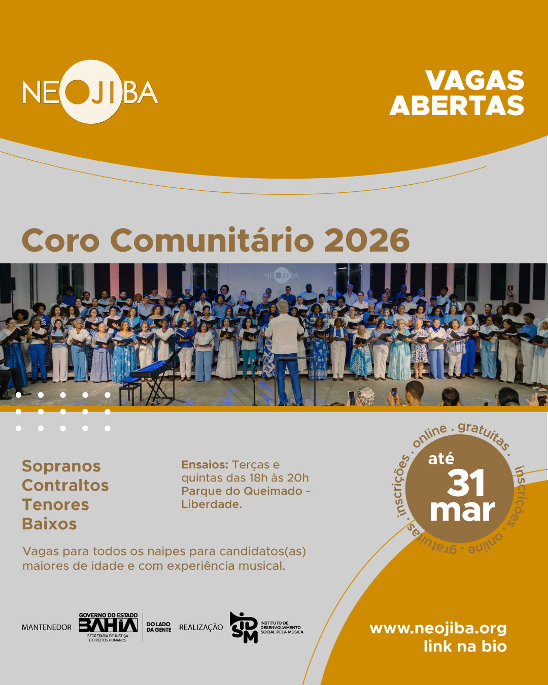 Estão abertas as inscrições para o Coro Comunitário do NEOJIBA 2026. O grupo oferece vagas para todos os naipes e é animador para pessoas maiores de 18 anos com experiência musical interessada em participar de atividades corais no programa.