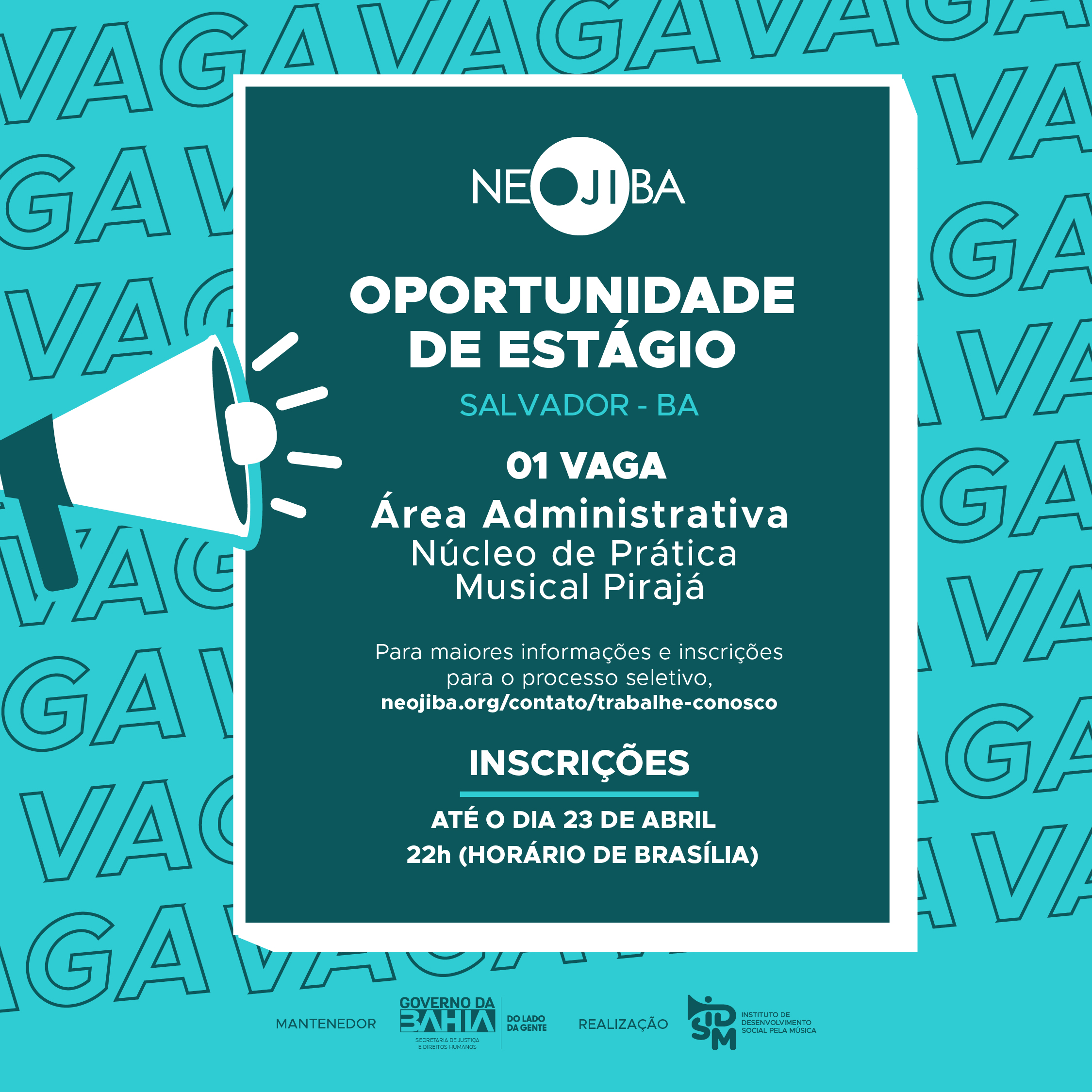 O Instituto de Desenvolvimento Social pela Música (IDSM), Organização Social que faz a gestão do PROGRAMA NEOJIBA (Núcleos Estaduais Juvenis e Infantis da Bahia), no uso de suas atribuições legais, torna pública a realização do Processo Seletivo Simplificado para contratação de 01 estagiário administrativo para atuar no setor Pedagógico, no Núcleo de Prática Musical Bairro de Pirajá.